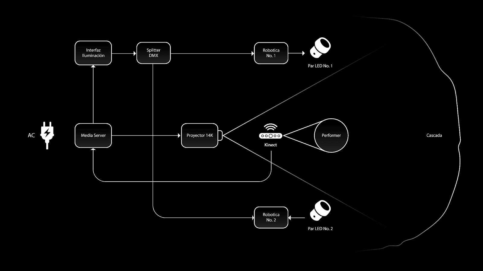 “El desarrollo de la instalación interactiva parte de un kinect direccionado al performer, midiendo sus movimientos en tiempo real. Estos datos se introducen a Touchdesigner, en donde seleccioné las partes del cuerpo que quería trackear y re-interpreté los datos obtenidos en parámetros correspondientes al comportamiento y tamaño de elementos 3D que también generé desde Touchdesigner. Esto, a través de Spout, se comunicó con Resolume Arena y salió directo al proyector. Trabajar y hacer los últimos ajustes estando en el interior del bosque y ver mis visuales de ese tamaño fue una experiencia increíble.”